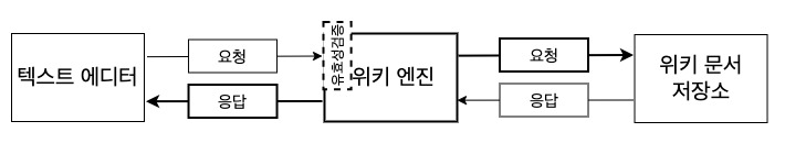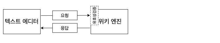 웹에서와 같은 시선으로 텍스트 에디터 기반 위키 엔진을 이해할 수 있다. 위키 엔진은 텍스트 에디터로부터 요청을 받는다. 그러면 위키 엔진은 요청이 올바른 형식의 요청인지 검증하고 나서 알맞은 응답을 연산해 텍스트 에디터에게 돌려준다. 여기서는 위키 엔진을 서버로, 텍스트 에디터를 클라이언트로 볼 수 있다.